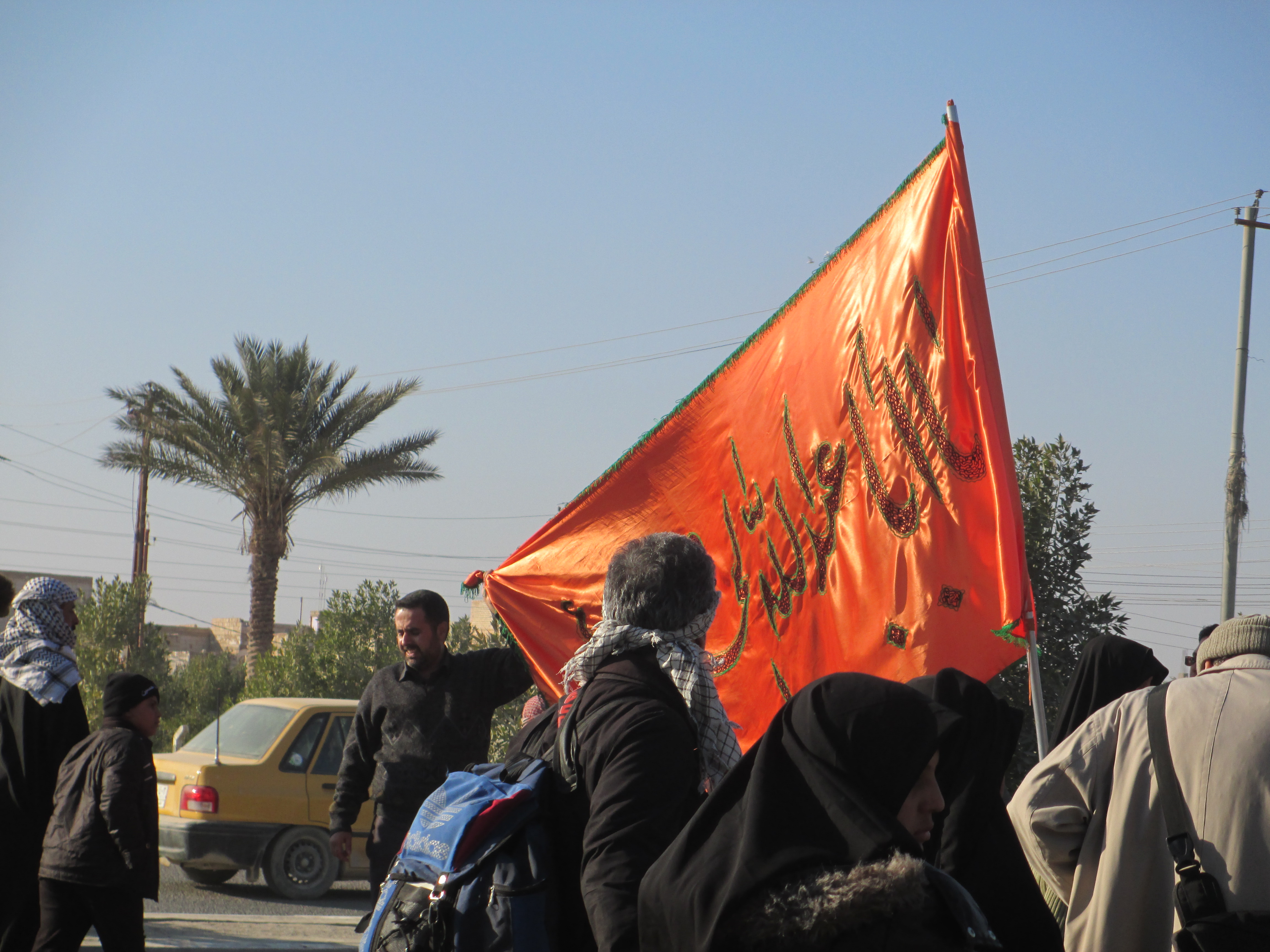 حمل این پرچم ها هم سختی و درد سر خاصی داشت، توی کاروان ما، بعضی ها زحمت های زیادی کشیدن، اقای لولاچیان که مدیر کاروان بودن و اقایان عباسی و زارعی و برهمند(که این سه عزیز خیلی توی تدارکات و حمل پرچم زحمت کشیدن) و اقای طاهری (بیشتر در نقش مترجم و راه بلد) و اقای اسیابانی و اقای سخندان و اقای عسگری (فیلم بردار و مداح) و اقای دکتر (دکتر واقعی، نه دکتر تقلبی) و خیلی های دیگه که اسمشون یادم نیست، ان شاء الله که اجر ویژه ای از این زیارت نصیبشون بشه